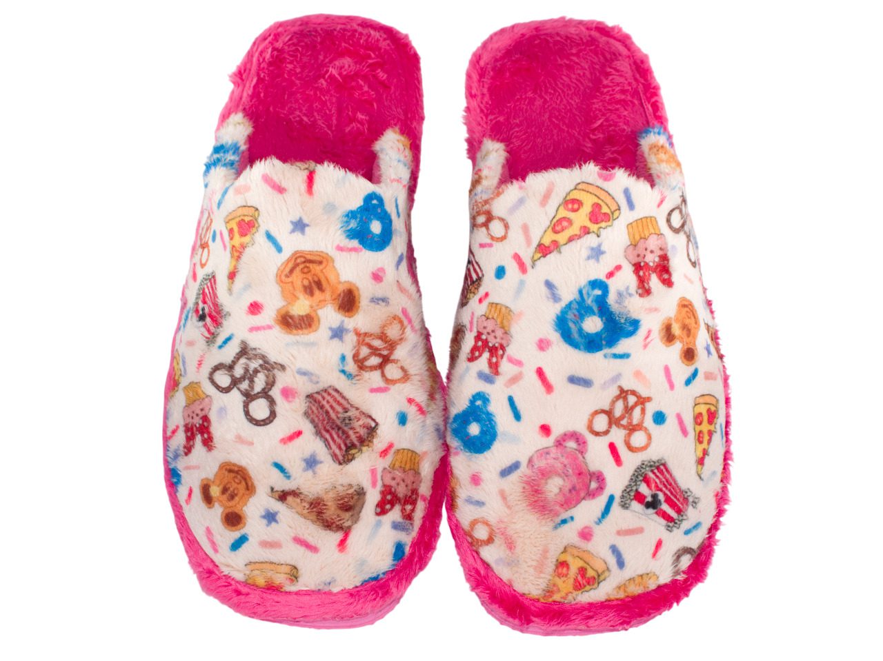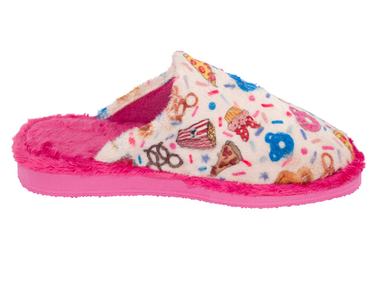 Estas zapatillas de casa Amoros destacan por su divertido diseño lleno de color, con estampados de palomitas, pizzas y dulces que aportan un toque alegre y original. Fabricadas con un tejido muy suave y un forro aterciopelado rosa, ofrecen una sensación cálida y agradable al caminar.