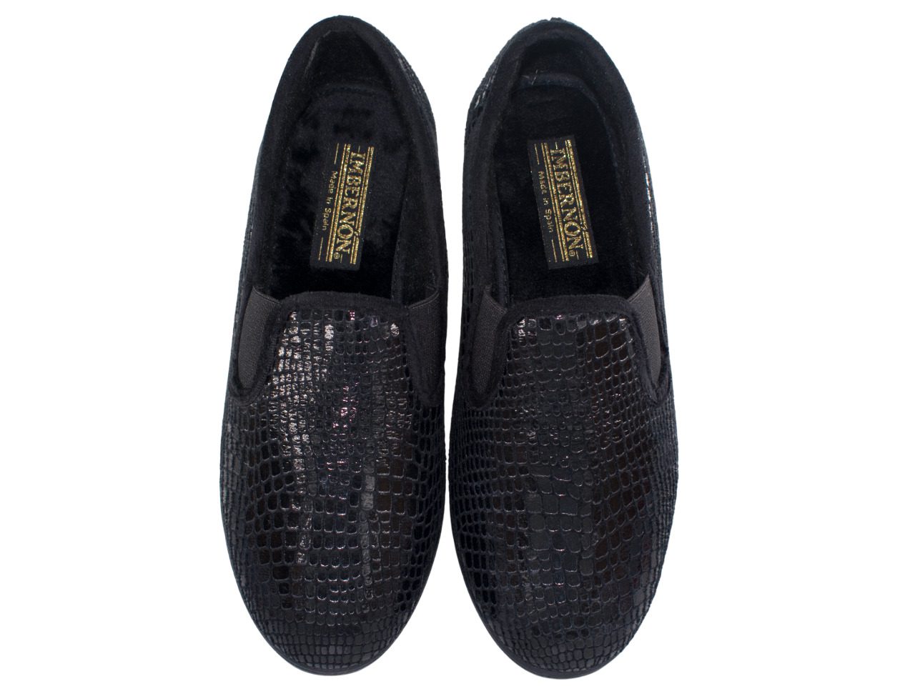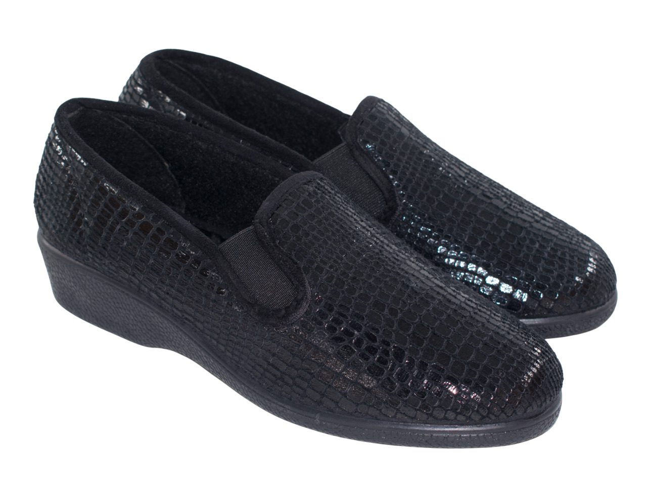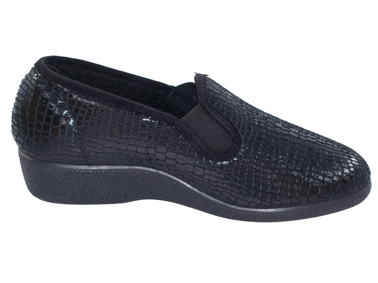 Estas zapatillas de casa para mujer destacan por su diseño moderno y sofisticado en color negro con acabado brillante tipo escamas. Son suaves, cómodas y perfectas para el uso diario en casa.
